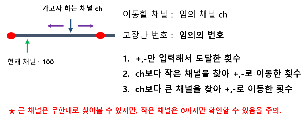 현재 채널(100)에서 +,- 만 사용해 이동한 횟수를 비교 대상에 두어야 합니다.