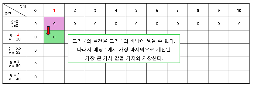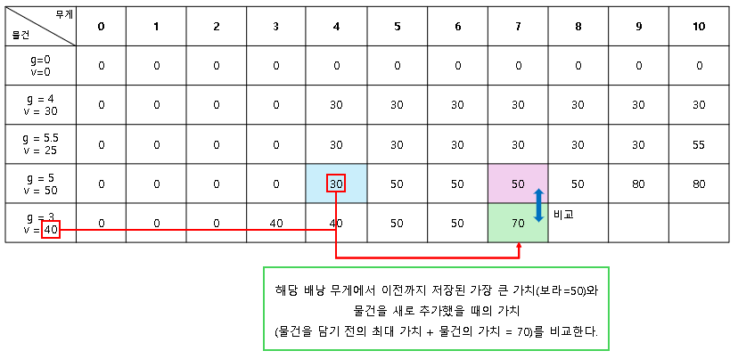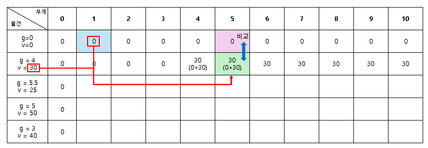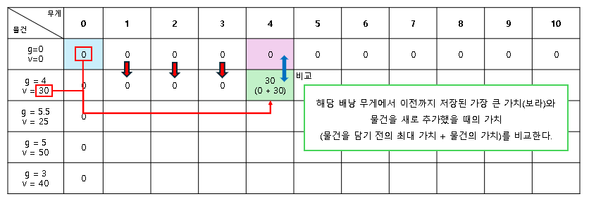 - 무게 0일 때의 배낭 가치(파란 셀) + 무게 4인 물건의 가치(30) = 0+30 = 30