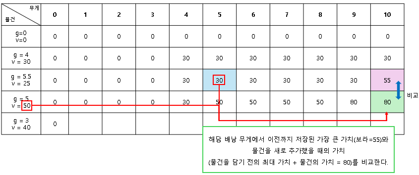 거기에 5.5 무게의 물건을 추가하니 30+25=55가 되었고, 이는 이전 배낭 10의 30가치보다 높다.