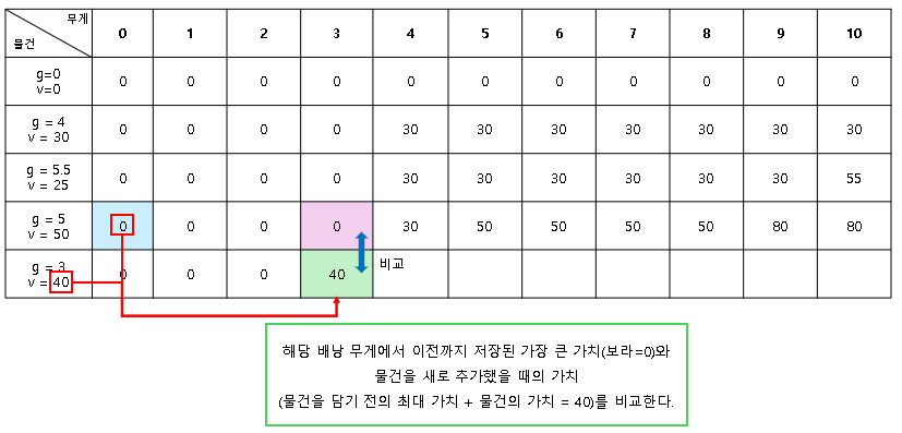 ③ 해당 무게의 배낭이 가지고 있던 최대 가치(보라 셀)와 새로 계산된 가치(30)를 비교한다.