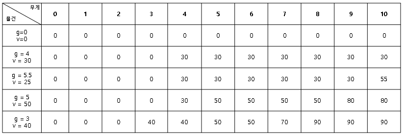 2행을 기준으로 배낭 10에서는 이전까지의 기록 상 30이 가장 큰 가치였다.