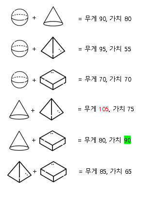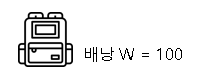 위의 경우, 물건의 무게가 배낭의 허용 무게를 초과하였으므로 담을 수 없다.