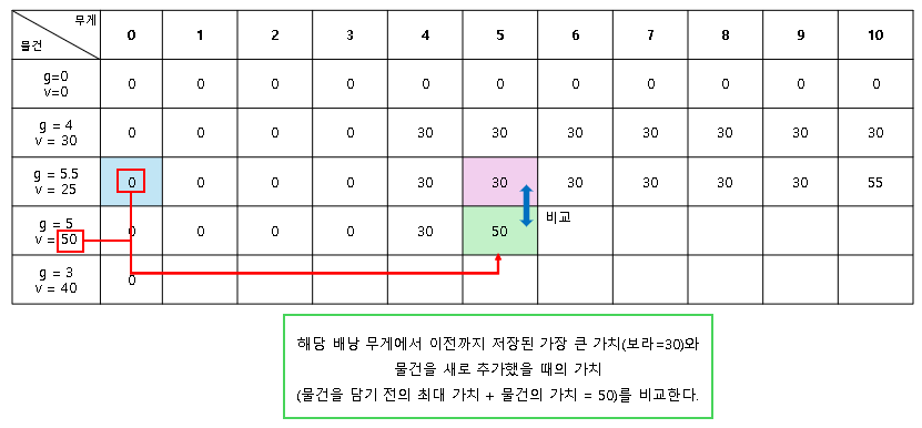 (해당 배낭 크기(열)에서 가장 큰 가치 - 보라 셀) vs (물건을 담기 전 배낭의 가장 큰 가치 - 파란 셀) + 추가할 물건의 가치