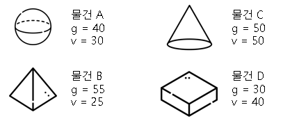 ob = ([40,30], [55,25], [50,50], [30,40]) # [무게, 가치]