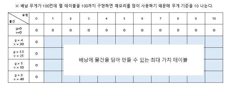 메모이제이션 테이블로 배낭의 무게 0~100까지의 열을 구성해야 하는데 이는 메모리를 많이 사용한다.